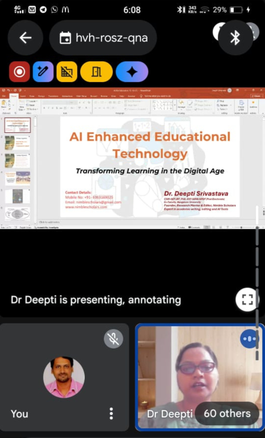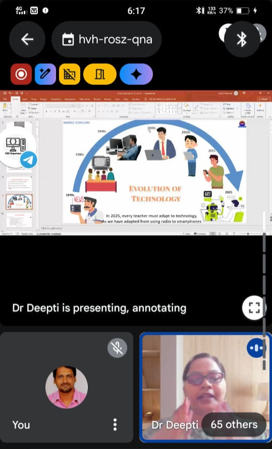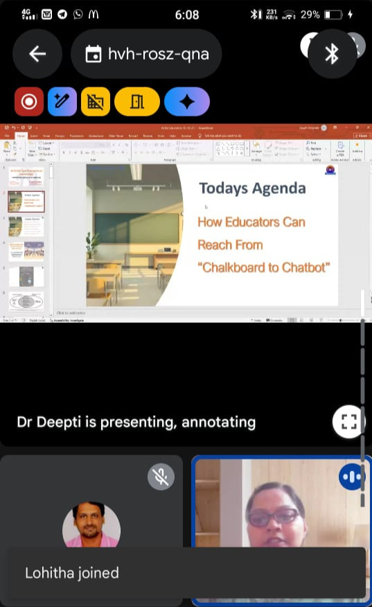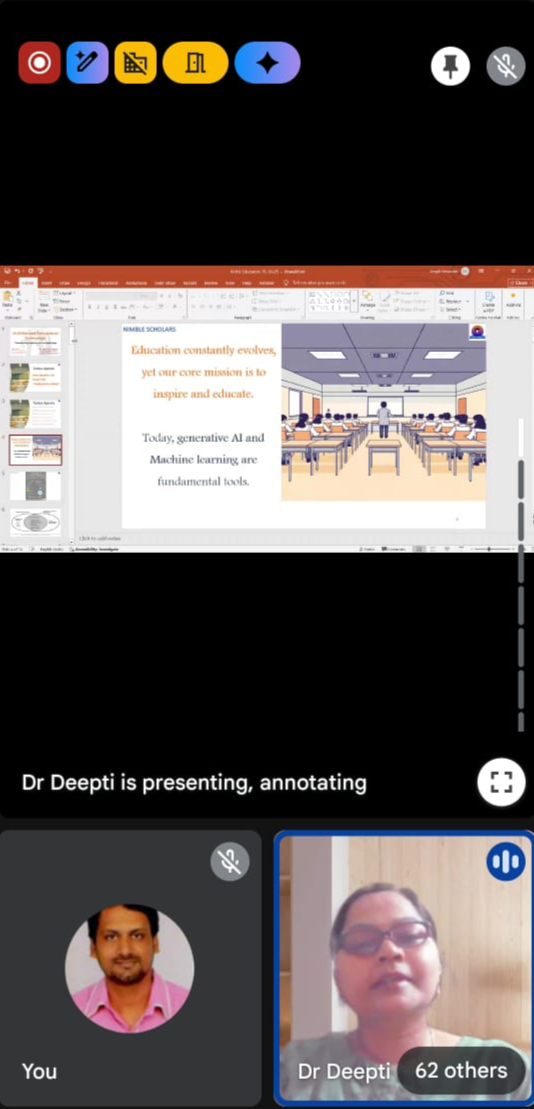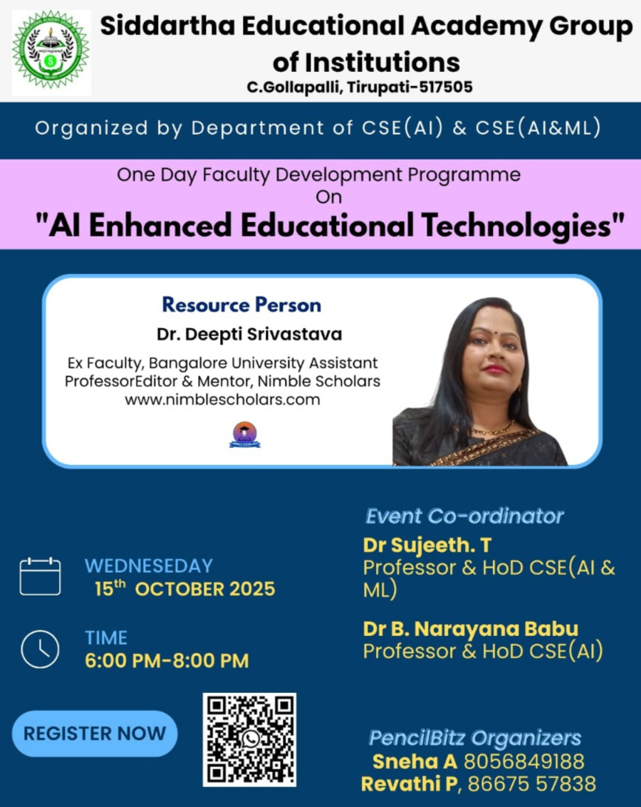 The Department of CSE(Artificial Intelligence ) and CSE(Artificial Intelligence and Machine Learning) organised a one-day online Faculty Development Programme (FDP) on AI Enhanced Educational Technologies on 15th Oct 2025. The FDP aimed to empower faculty members with knowledge and hands-on experience in using cutting-edge Artificial Intelligence (AI) tools to enhance teaching effectiveness, personalise learning, and improve academic engagement.