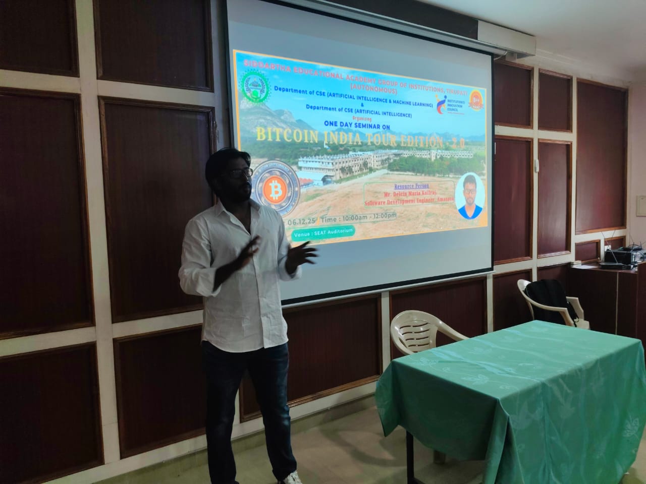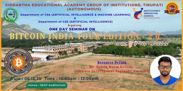 The Department of CSE(Artificial Intelligence ) and CSE(Artificial Intelligence and Machine Learning) organised a one Day Seminar title BITCOIN INDIA TOUR EDITION2.0 on 06.12.2025. Resoure Person Mr. Delcin Maria Koilraj, talks about Cryptocurrencies, Bitcoin & Bitcoin Platform. He started from the scratch then he discussed about cryptocurrency, and Bitcoin. In this particular, he has also discussed crypto assets, unity tokens, security tokens, stable coins, and central banks, using real-time data experiments. Also he demonstrated the program implementation whereas how to create the coins and how it is benefitted us, and how to transact the coins.