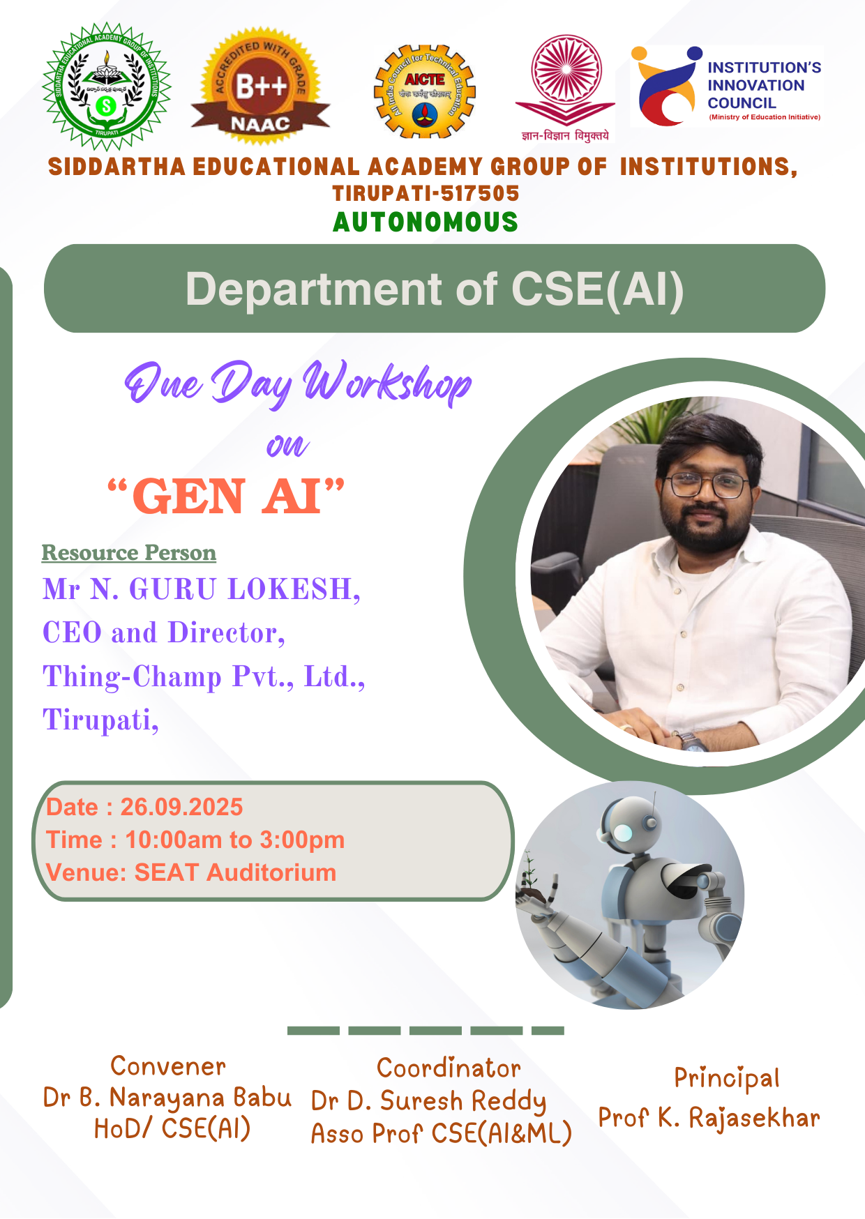 Our Department of CSE(Artificial Intelligence) conducted a one - day workshop on “Generative AI" for second year B.Tech., CAI, CSM & CSE students on 26.09.2025 at 09:30 am in SEAT - Auditorium. The Resource Person of the program Mr.GURU LOKESH,CEO & Director, Think-Champ, Tirupati. The Session was more interested and interactive, students asked many questions regarding the presentation and get cleared their doubts. They also created their own app, applying learned concepts and showcasing creativity.